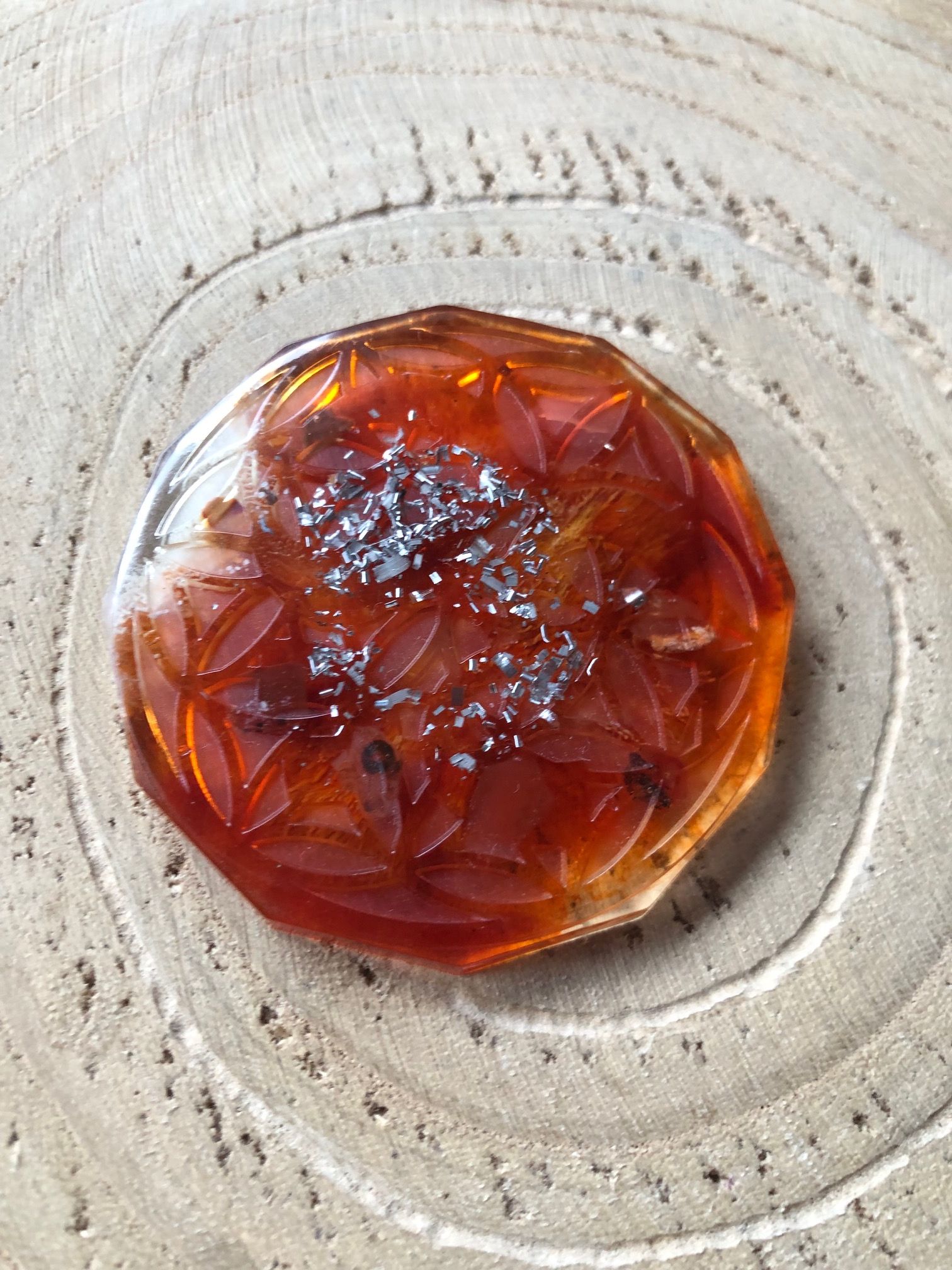 Deze kleine orgonite bevat naast hars en metaal de edelsteen Carneool.