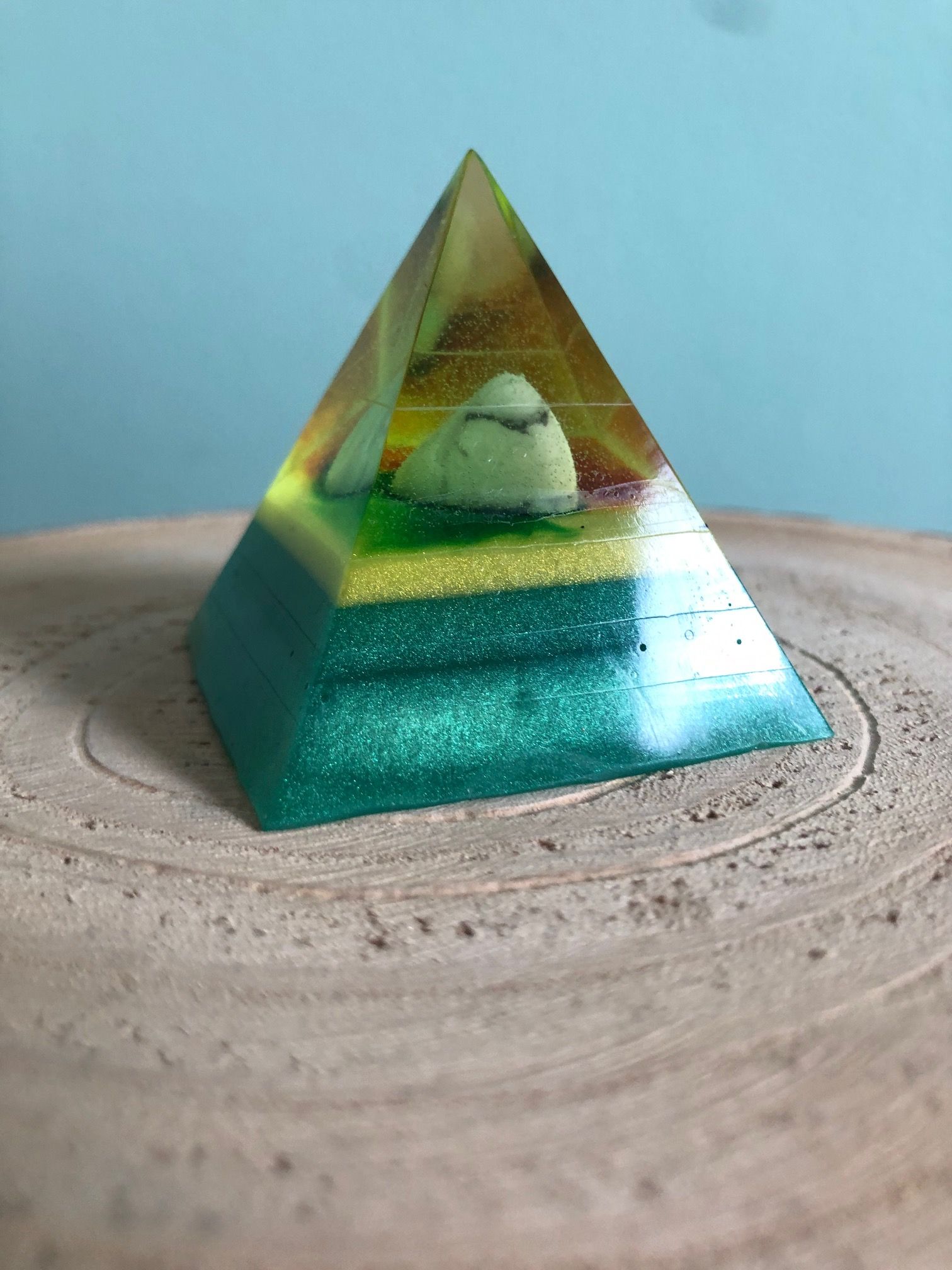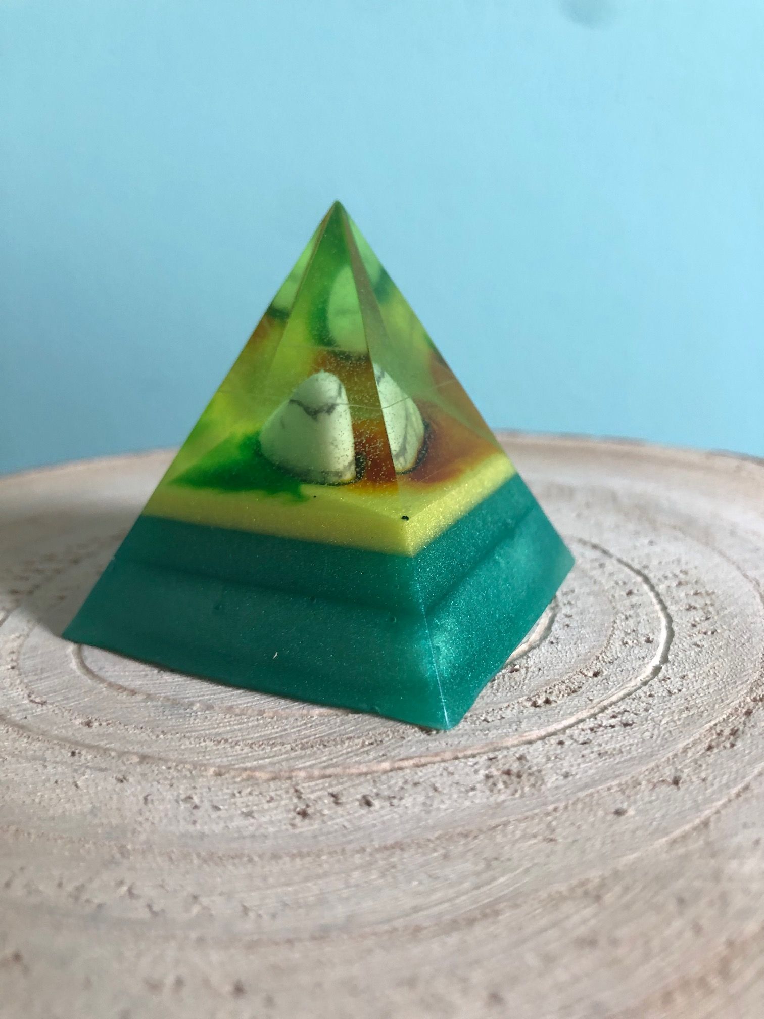 Deze kleine orgonite in piramidevorm in de kleuren geel en groen, bevat naast hars en metaal de edelsteen Howliet.