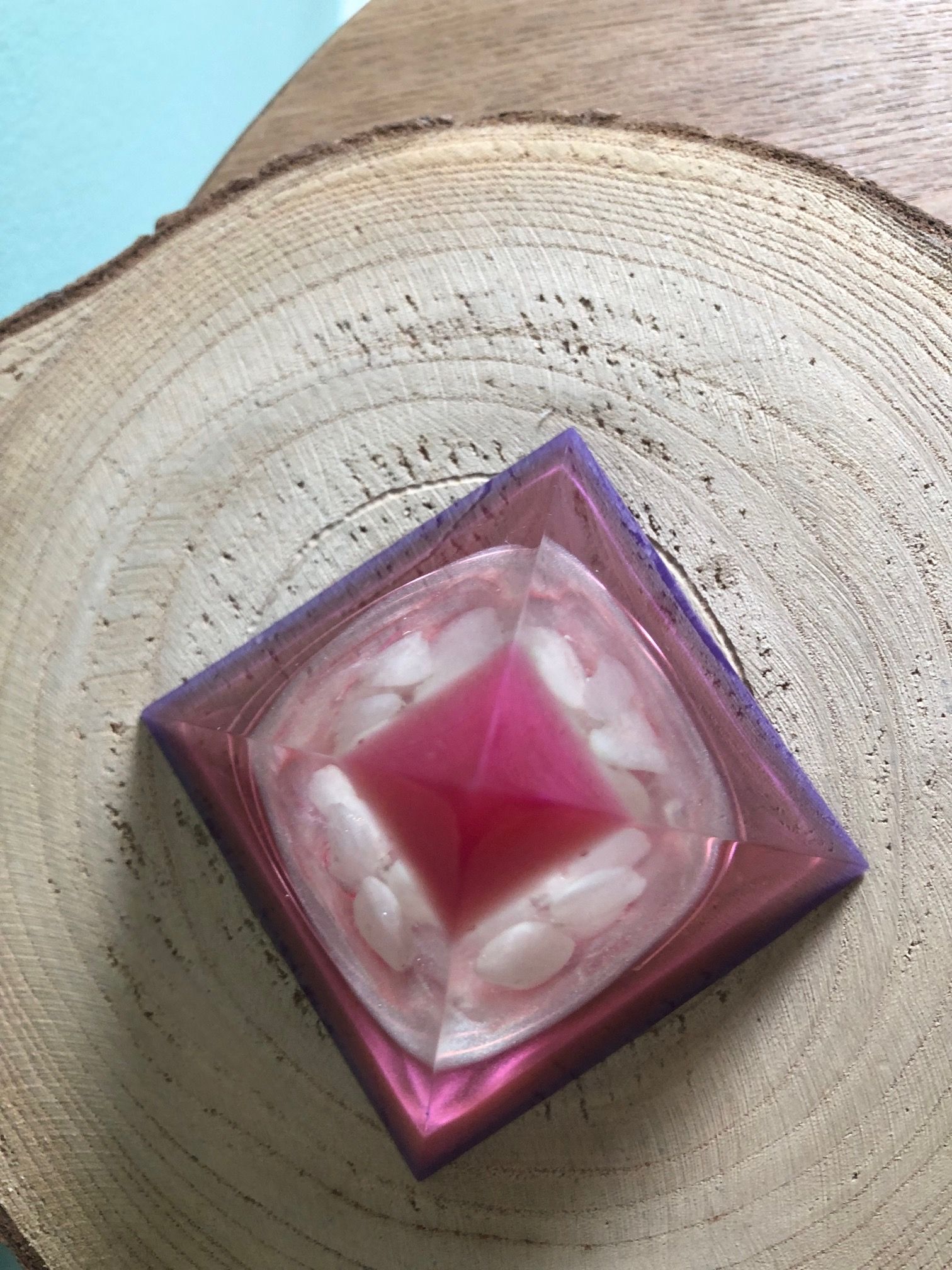 Deze prachtige Orgonite in de kleuren roze en paars, bevat naast metaal en hars de edelsteen Rozenkwarts .
